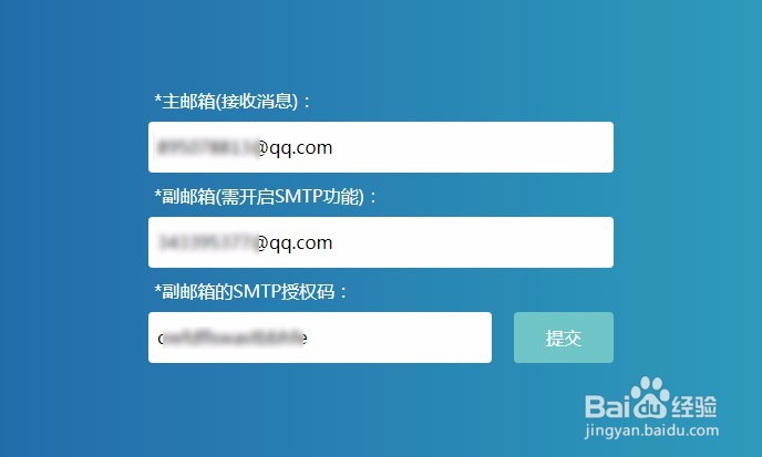 浏览器进入网址:ifeedback.leanapp.cn,根据提示填写你的主接收邮箱、SMTP邮箱及对应的授权码(如不知到如何开启或获取授权码可参照百度经验——如何开通电子邮箱的SMTP功能),输入完毕后点[生成]并确认接收邮箱的信息。