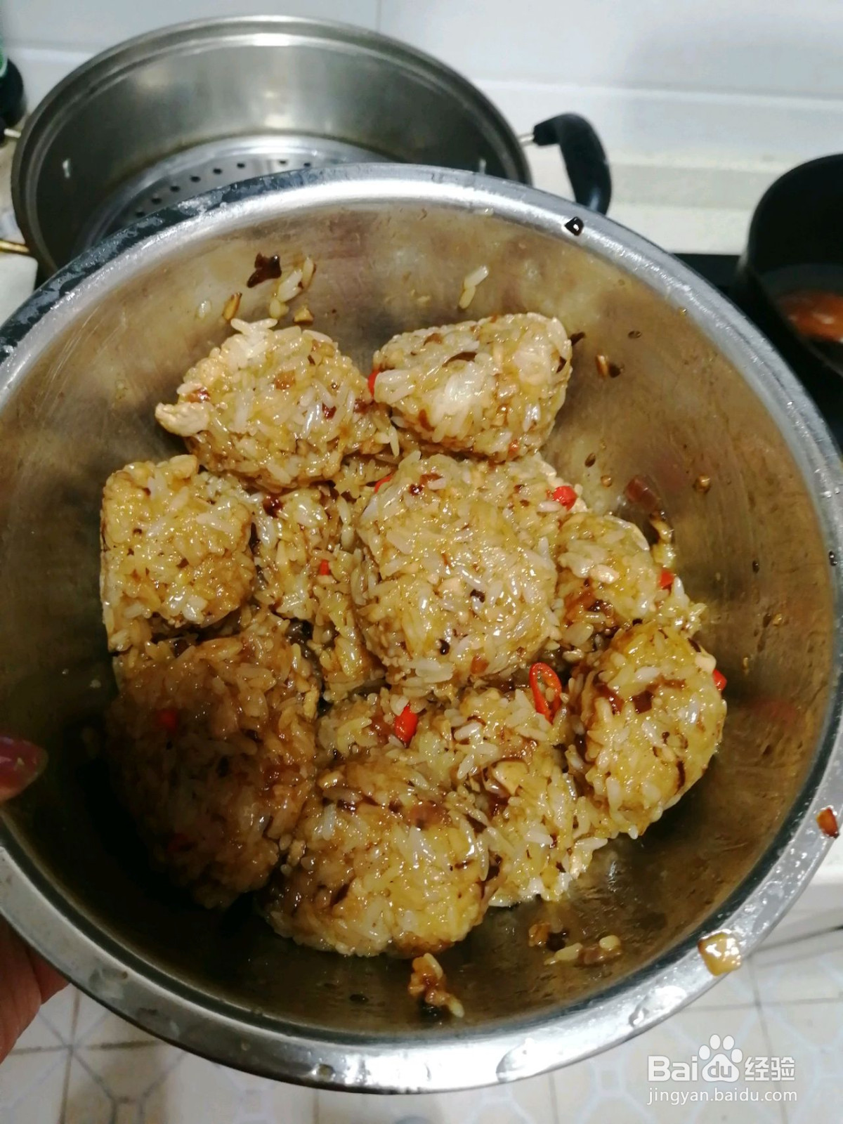 把酱和蒸好的糯米拌均匀,可以提前搓成大球球。拌的饭可以直接吃,可以试一试味道,不行外放点调料。