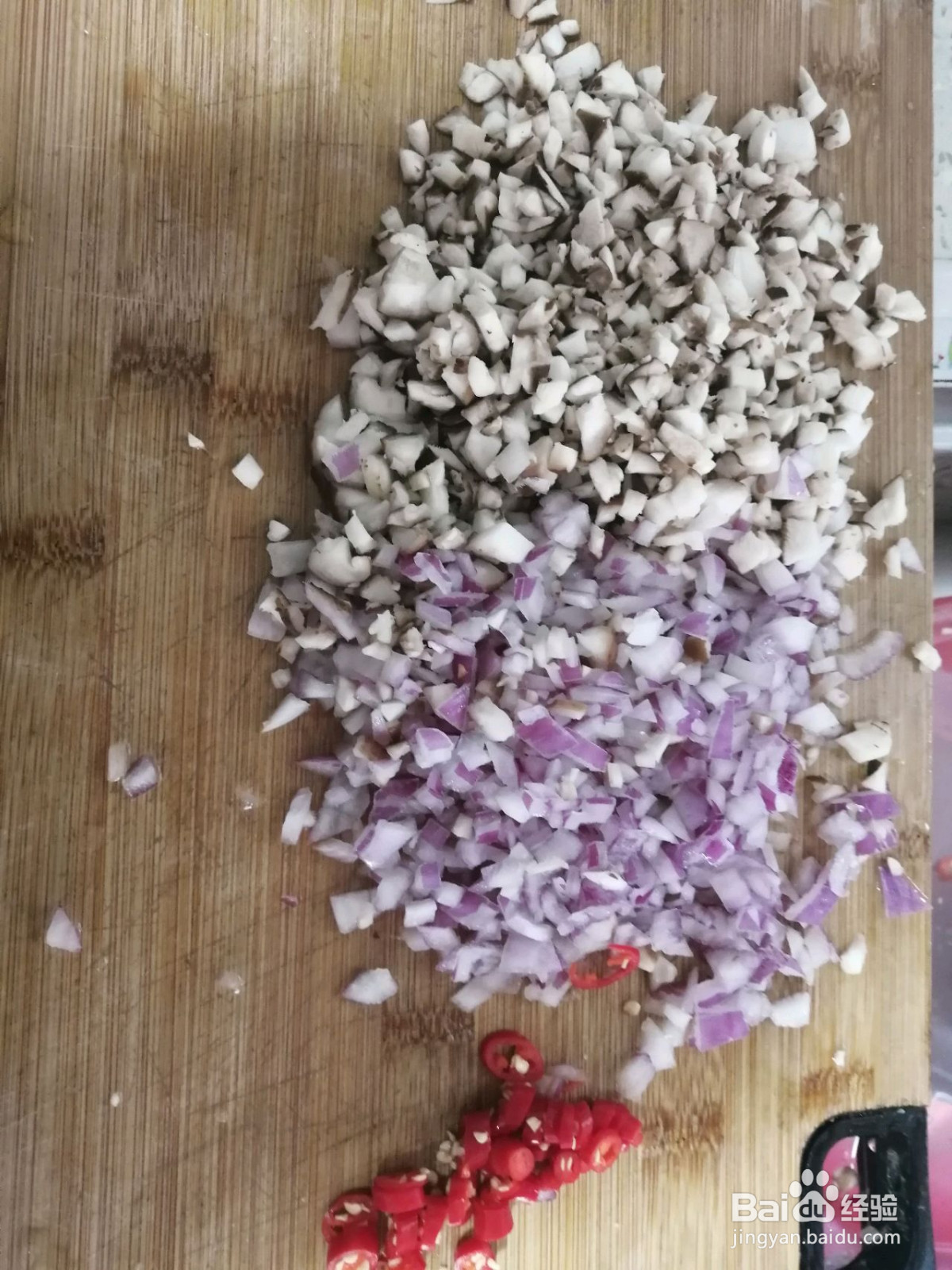 香菇洋葱切碎,喜欢辣的就放两根辣椒