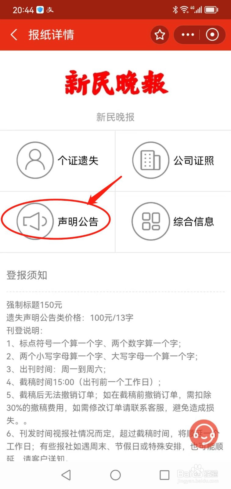 点击“申明公告”。包言低