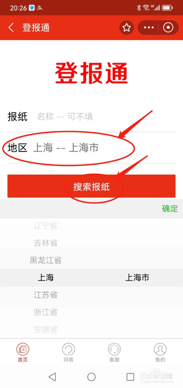 选择地区,然后点击“搜索报纸”。哄昆