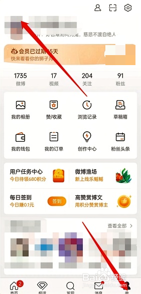 打开微博,在界面点击我的,然后点击上方的个人头像。