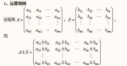 乘法运算:两个矩阵要可以相乘,必须是A矩阵的列数B矩阵的行数相等,才可以进行乘法,矩阵乘法的原则是,A矩阵的第i行中的元素分别与B矩阵中的第j列中的元素相乘再求和,得到的结果就是新矩阵的第i行第j列的值。
