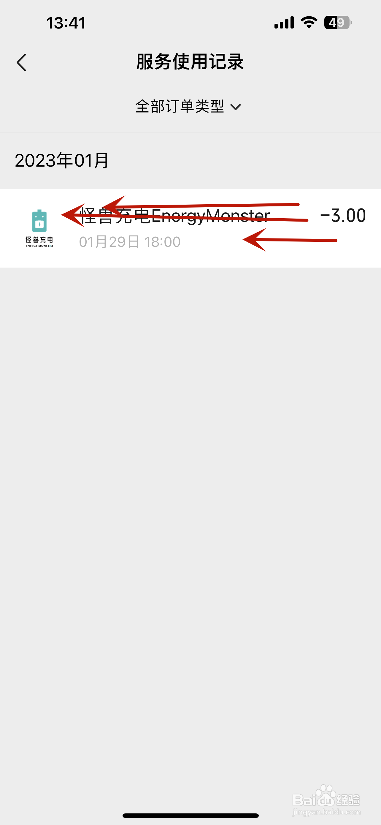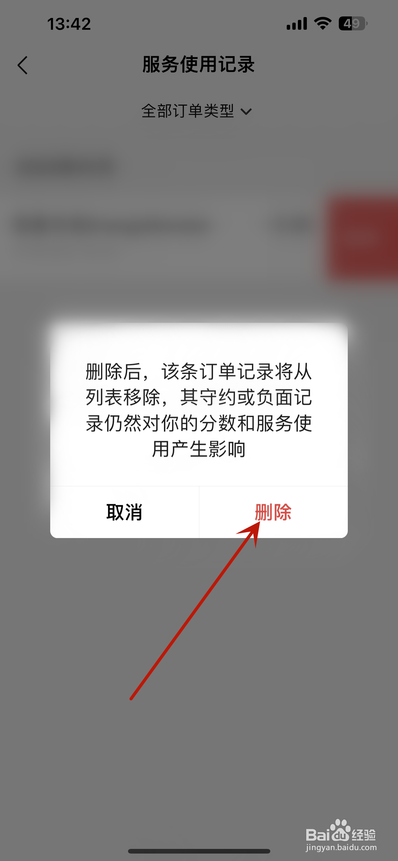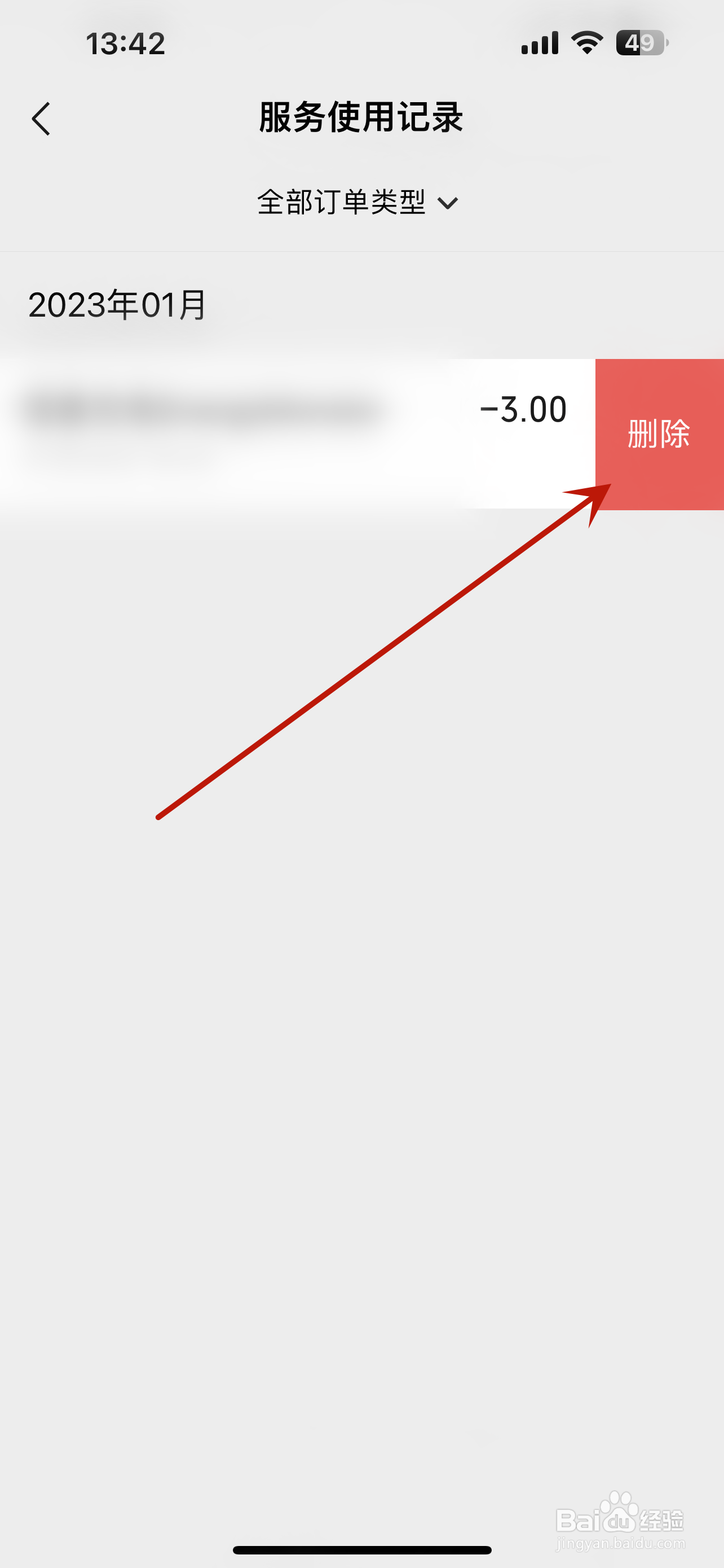 打开服务使用记录的界面长按要删除的服务使用的订单“向左滑动“下,