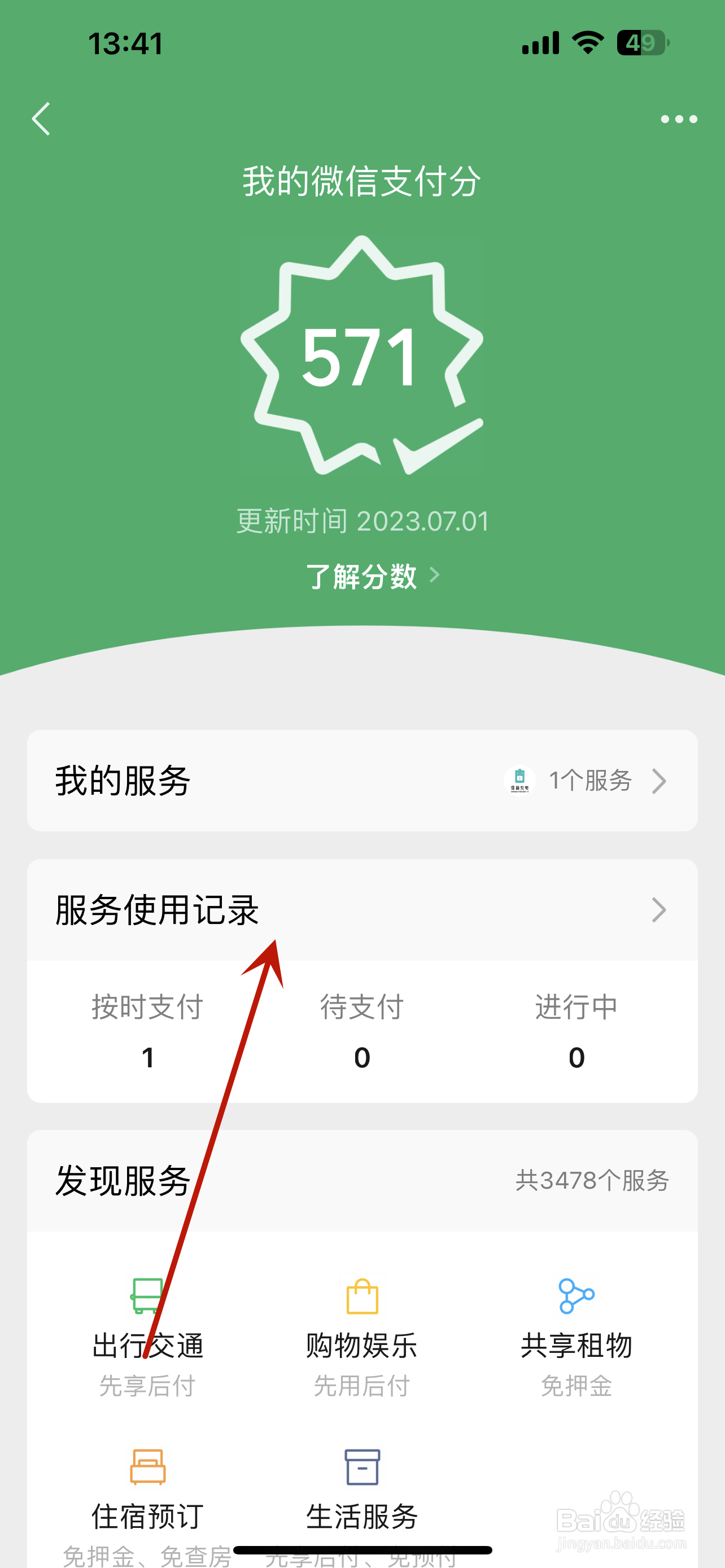 打开微信后进入到我的微信支付分的界面点击”服务使用记录“选项,