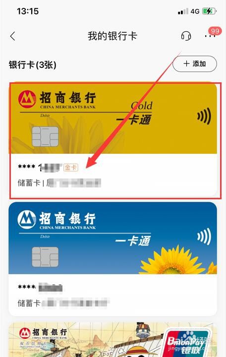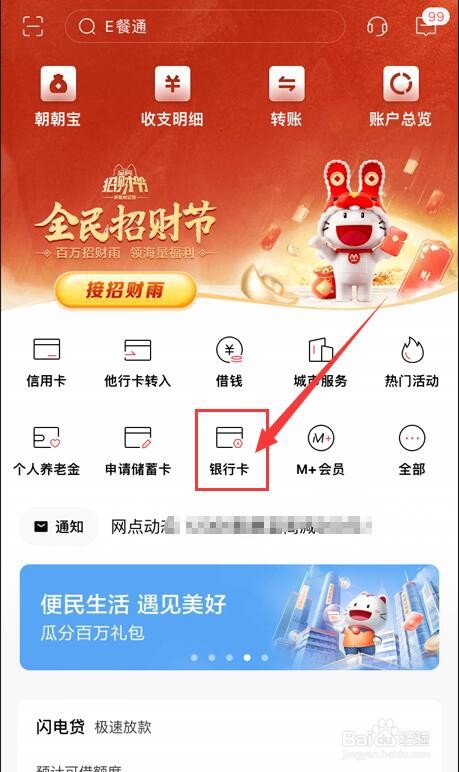 打开招商银行APP,进入首页,选择“银行卡”。如图:
