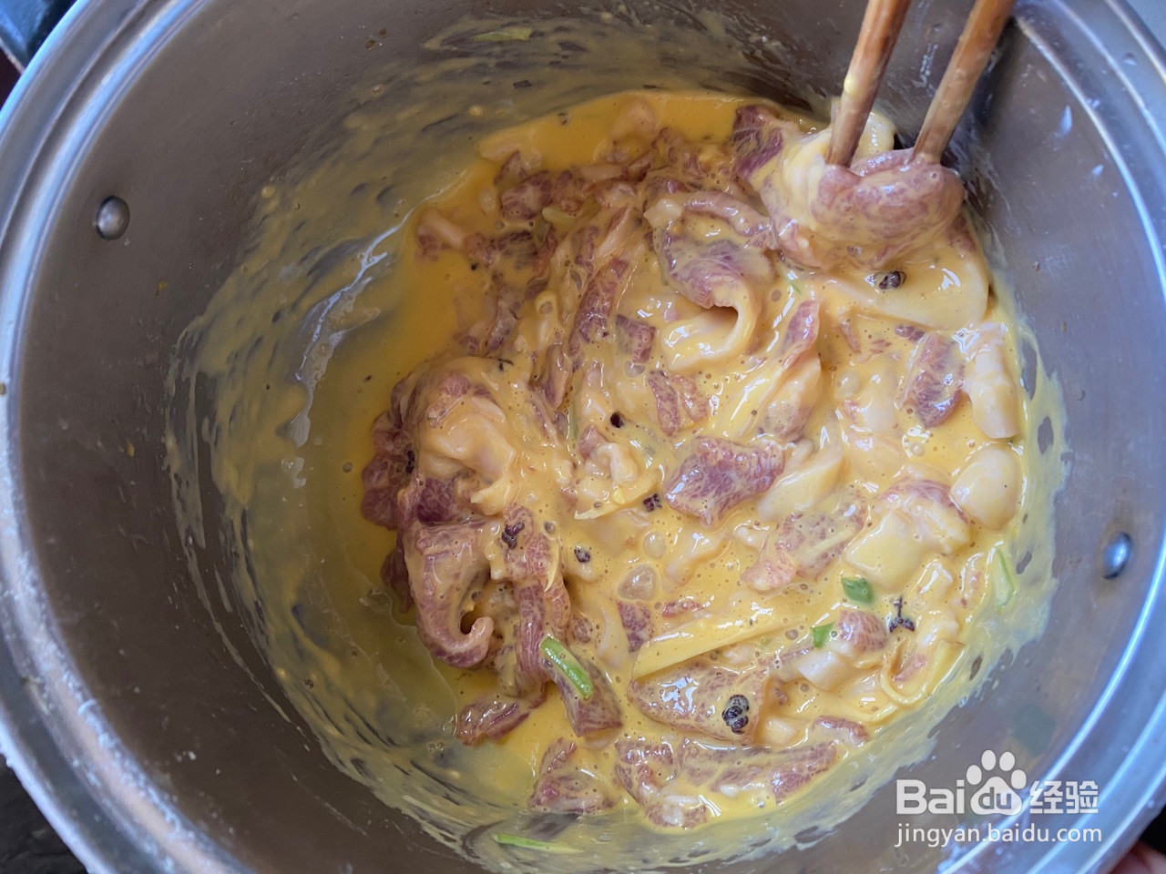 腌好的肉放进糊里拌匀,为了省时间没有把姜完全挑干净