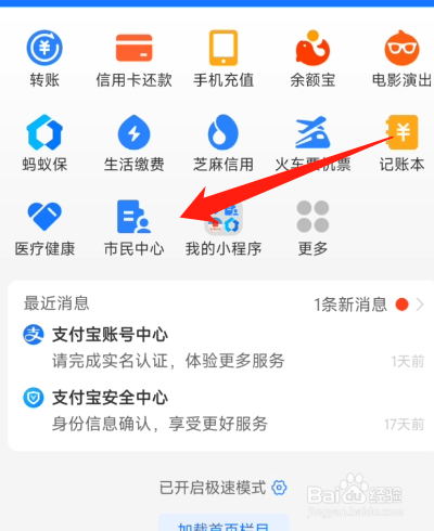 第一步在支付宝APP界面点击市民中心,如下图所示