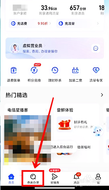 打开中国电信,点击下方【查询办理】。