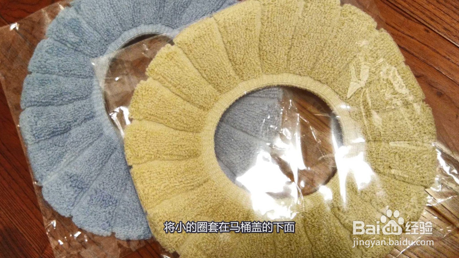 可以将马桶的盖子翻上去,顺着马桶盖的下面渐渐的往上套,将小的圈套在马桶盖的下面,把大的圈往上拉并将它往后翻一圈,那么大的圈就可以裹住整个马桶的盖子了。