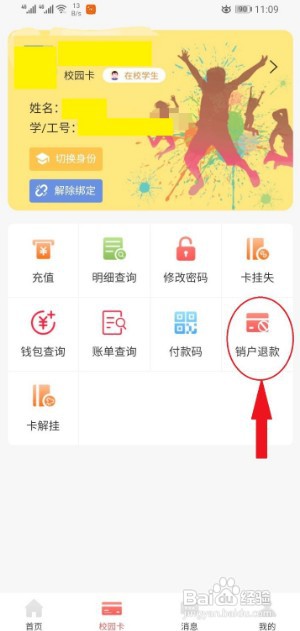 然后在校园卡界面里,点击销户退款。
