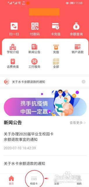 在手机上打开app,在app首页界面里,点击下方的校园卡。