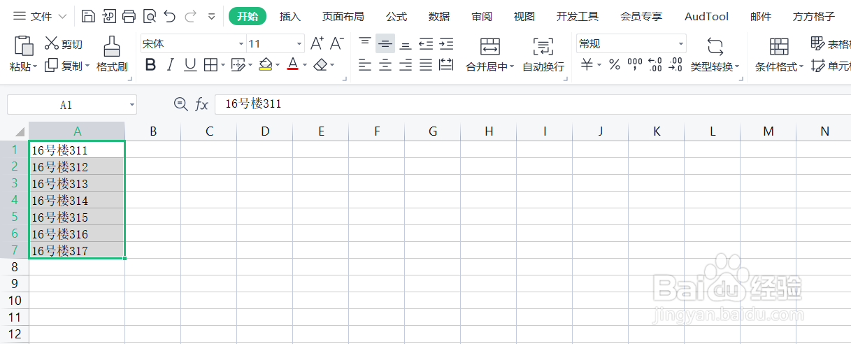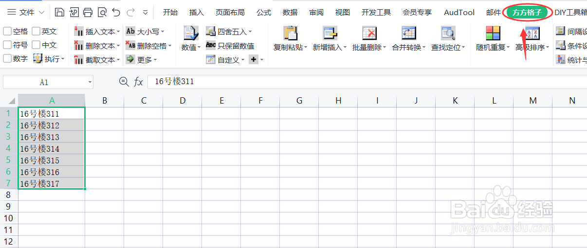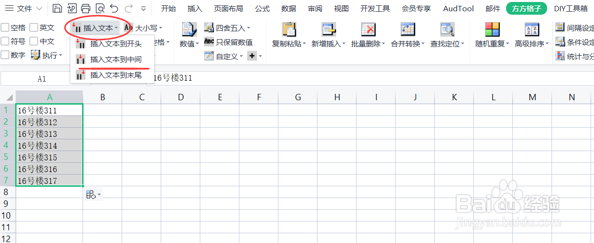 若我们想要在宿舍门牌号和宿舍楼号中加一个横杠,我们可以这么做。选择我们想要插入的文本。