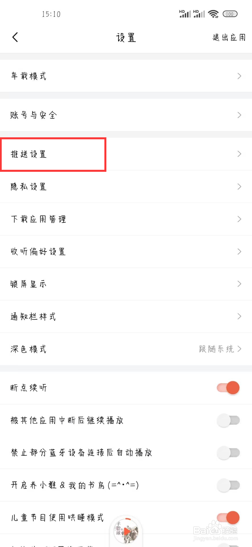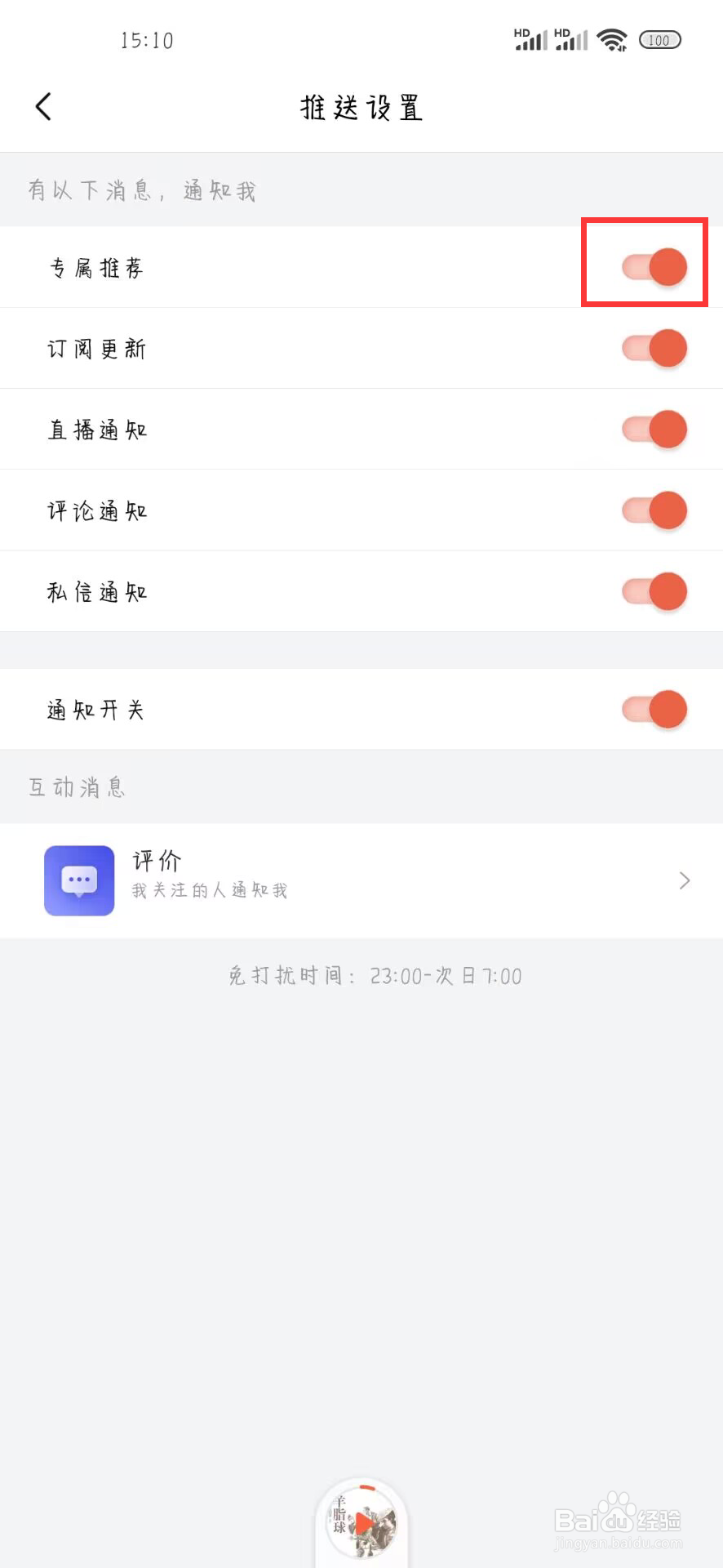 3、在推送设置页面之后,找到专属宿联菌推荐,点击右面的按钮关闭就行了