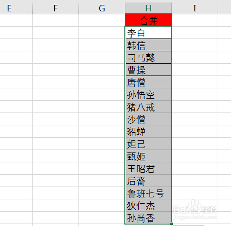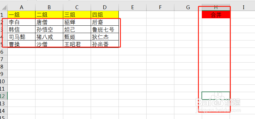 1、如下图,需要将A到D四列的数据合并到H列下;