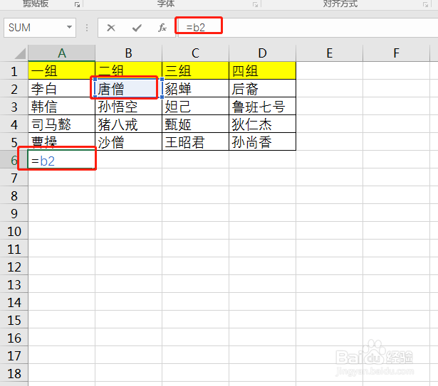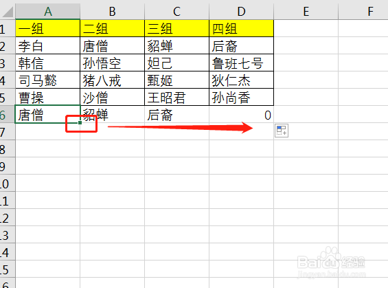 3、然后将鼠标放置在A6单元格右下角,呈现黑色十字形,向右拉到D6单元格;如下图