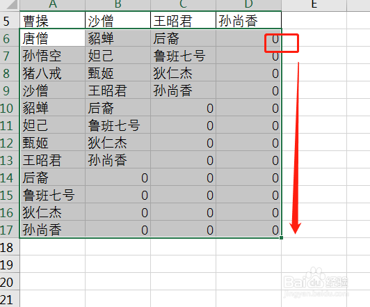 4、然后将鼠标放置在D6单元格右下角,呈黑色十字形,向下拉,直到A列内有单元格显示为【0】为止;如下图