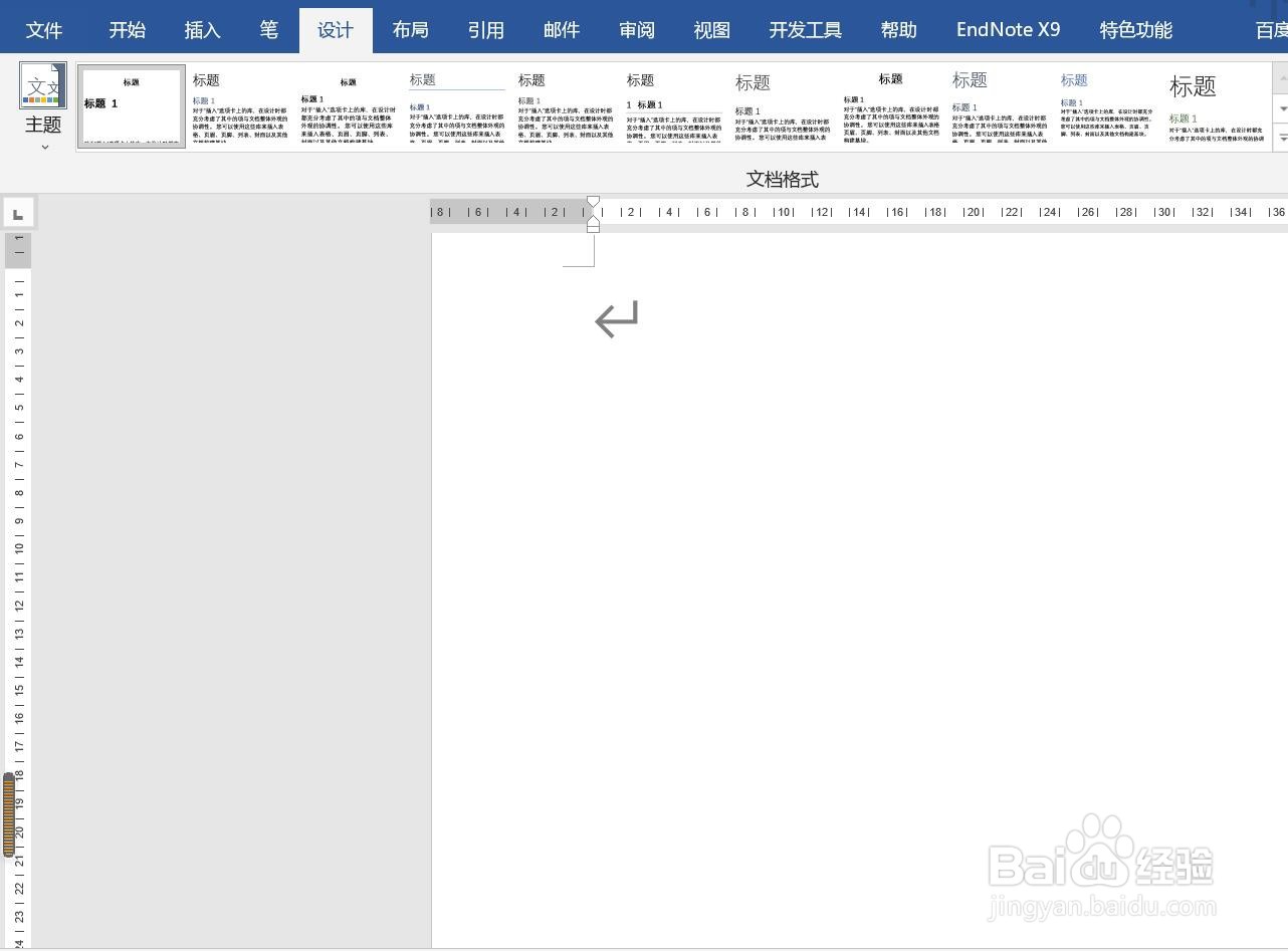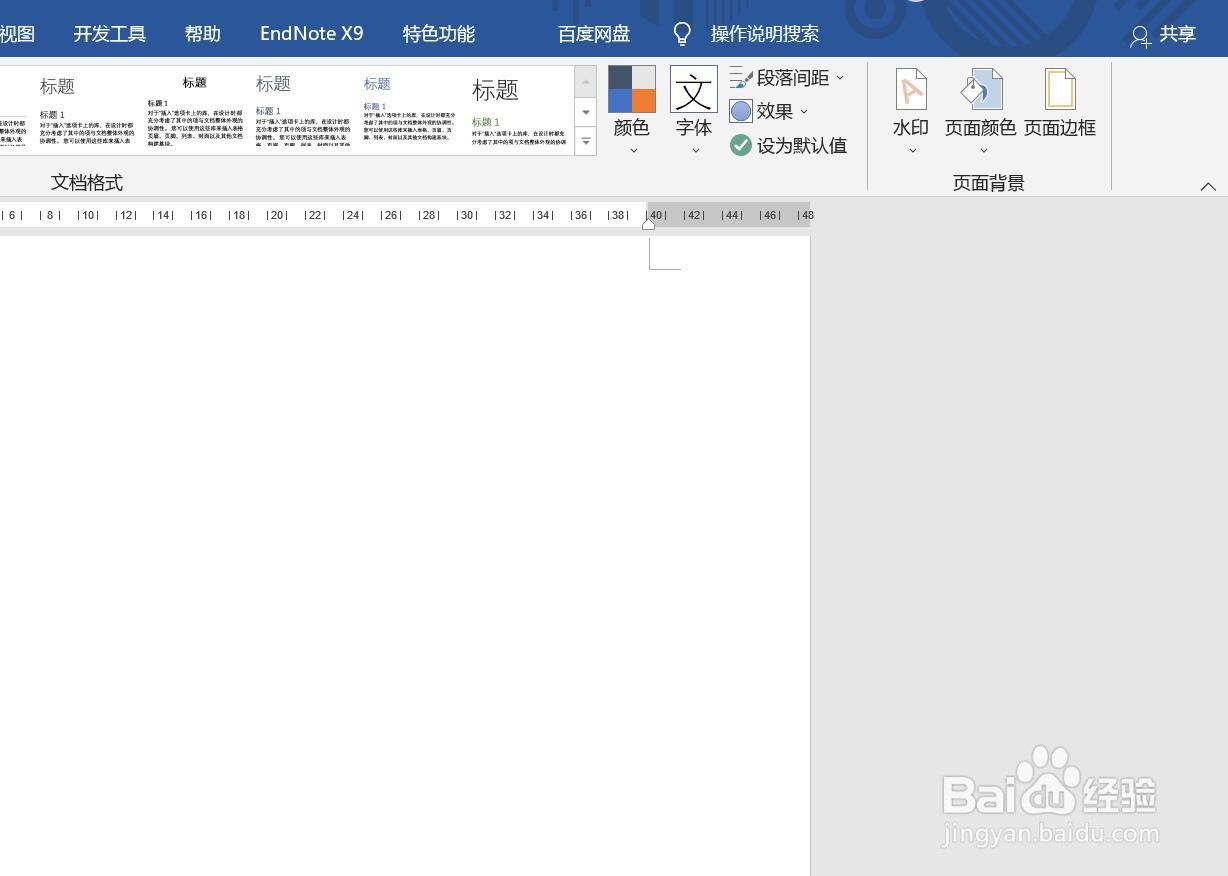 进入word主页,可以发现此时默认演示为无色(白色),想要改变颜色,需要点击标题栏的【设计】选项;
