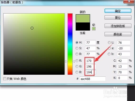 在该对话框内设置R、G、B的值分别为170、196、104,如图所示: