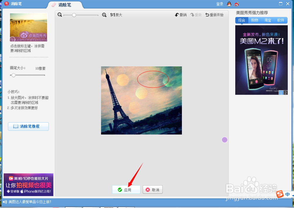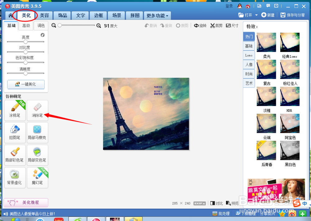 图片打开后,点击美图秀秀左上角的美化后,点击消除笔。