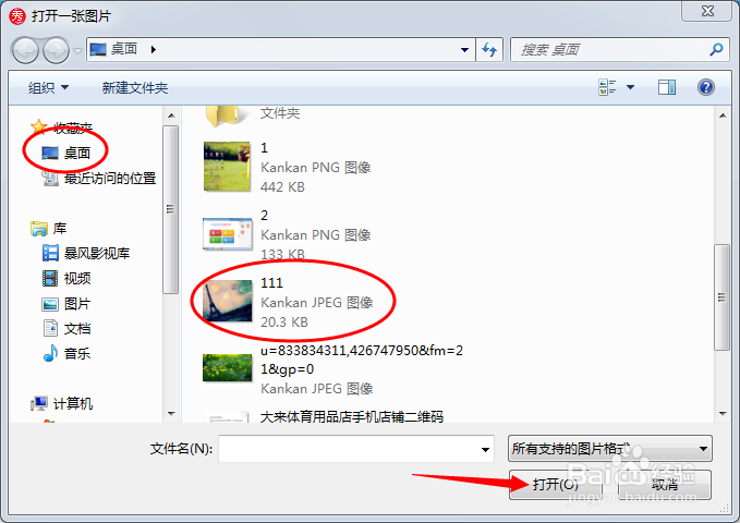 选择图片所在的文件夹,鼠标左键点击图片后,点击打开。