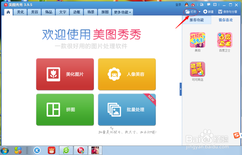 美图秀秀打开后,点击页面右上角的打开,打开要添加文字的图片。