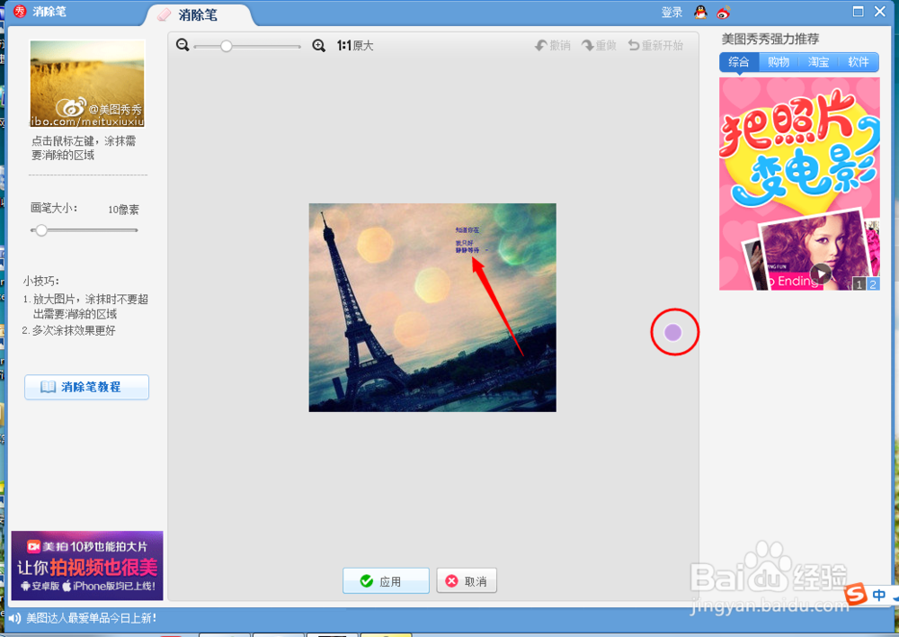消除图片上多余的图像或文字,使图片更加完美。以消除图片上的字为例。