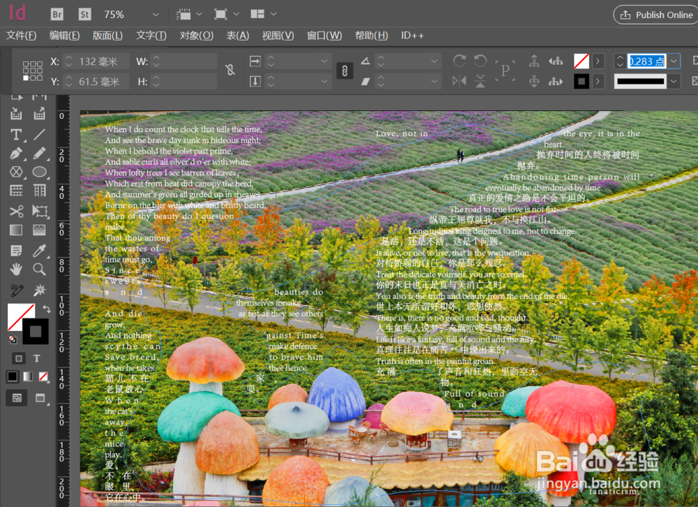 InDesign中,默认情况,文字是沿着文本框有规则的排列着,但通过里面的绕排方式,我们可以让文字沿着指定的轮廓线进行排列,从而到达特殊的排版效果,下面说下其方法。