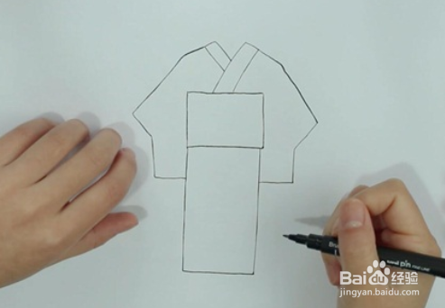 我们首先画出和服的衣领,然后在两边绘出宽大的袖子,领子的下面画一块宽宽的腰带,下面再画上直筒状的裙摆。