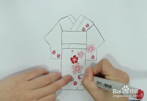 接着在腰带下面的三分之一处画上一套分割线,然后在裙摆上画出一些或大或小的樱花和花瓣,袖子和领口也画一些樱花。