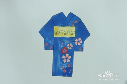 我们给和服铺上一层宝蓝色,然后用黄色涂腰带,最后用黑色勾线笔绘出腰带上的花纹,一件漂亮的和服就画好啦。