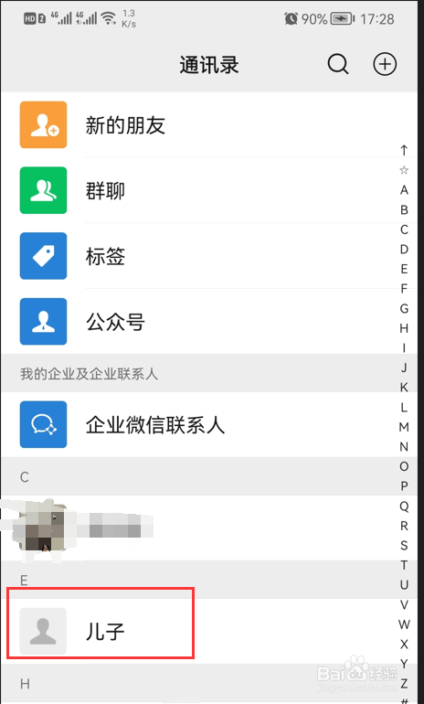 第七步:打开微信,切换到通讯录,找到需要移动到桌面的联系人,如“儿子”,点击这个名字。