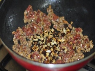 锅内放入猪油,加热至融化,加入猪肉、木耳、香菇、冬笋和胡萝卜,炒匀。