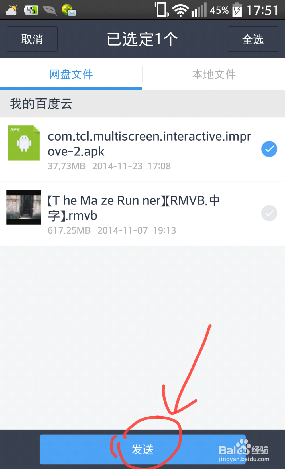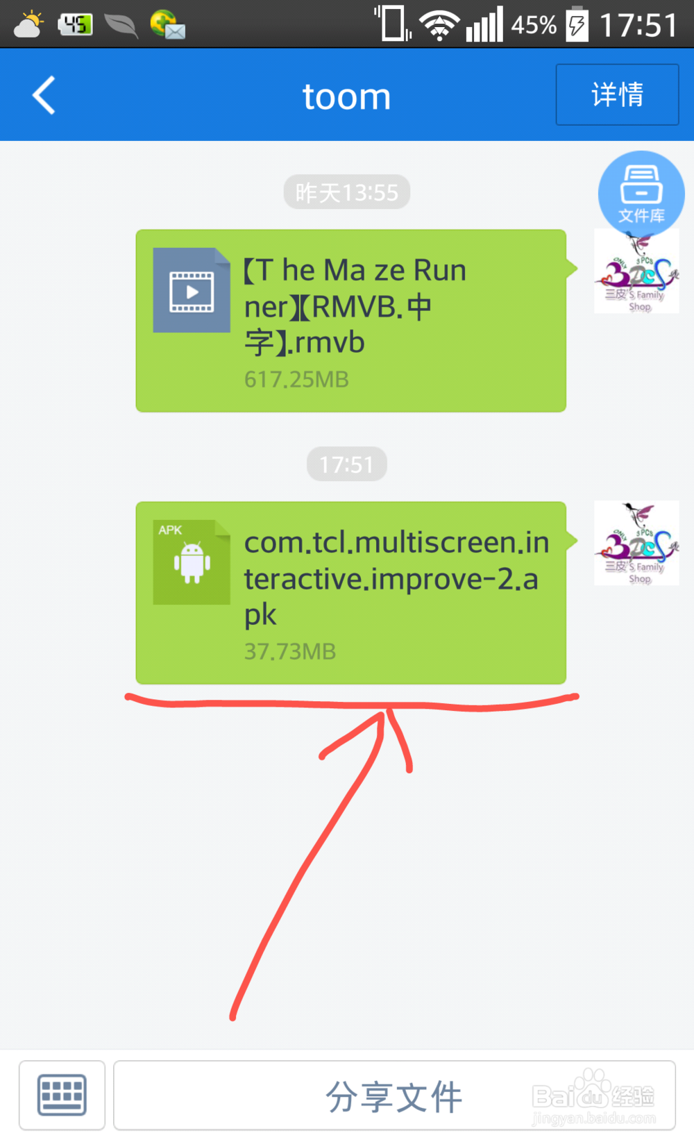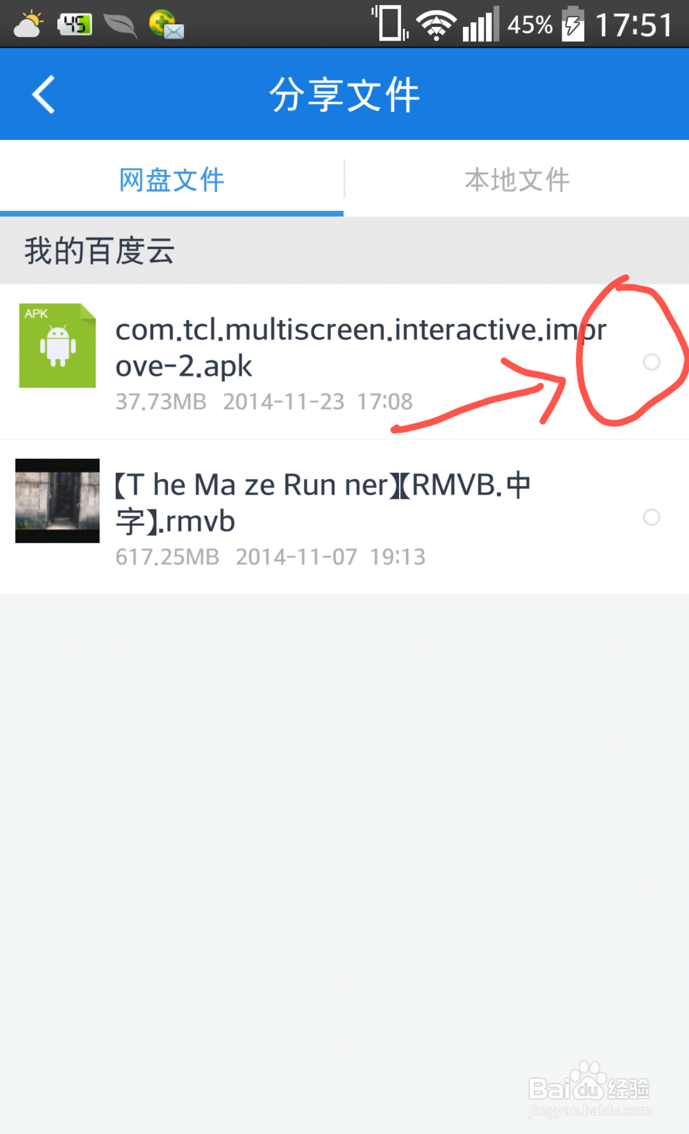选择好友之后,进行文件选择分享,在这里我分享一个手机APP软件给我的好友。如图点击选中文件。