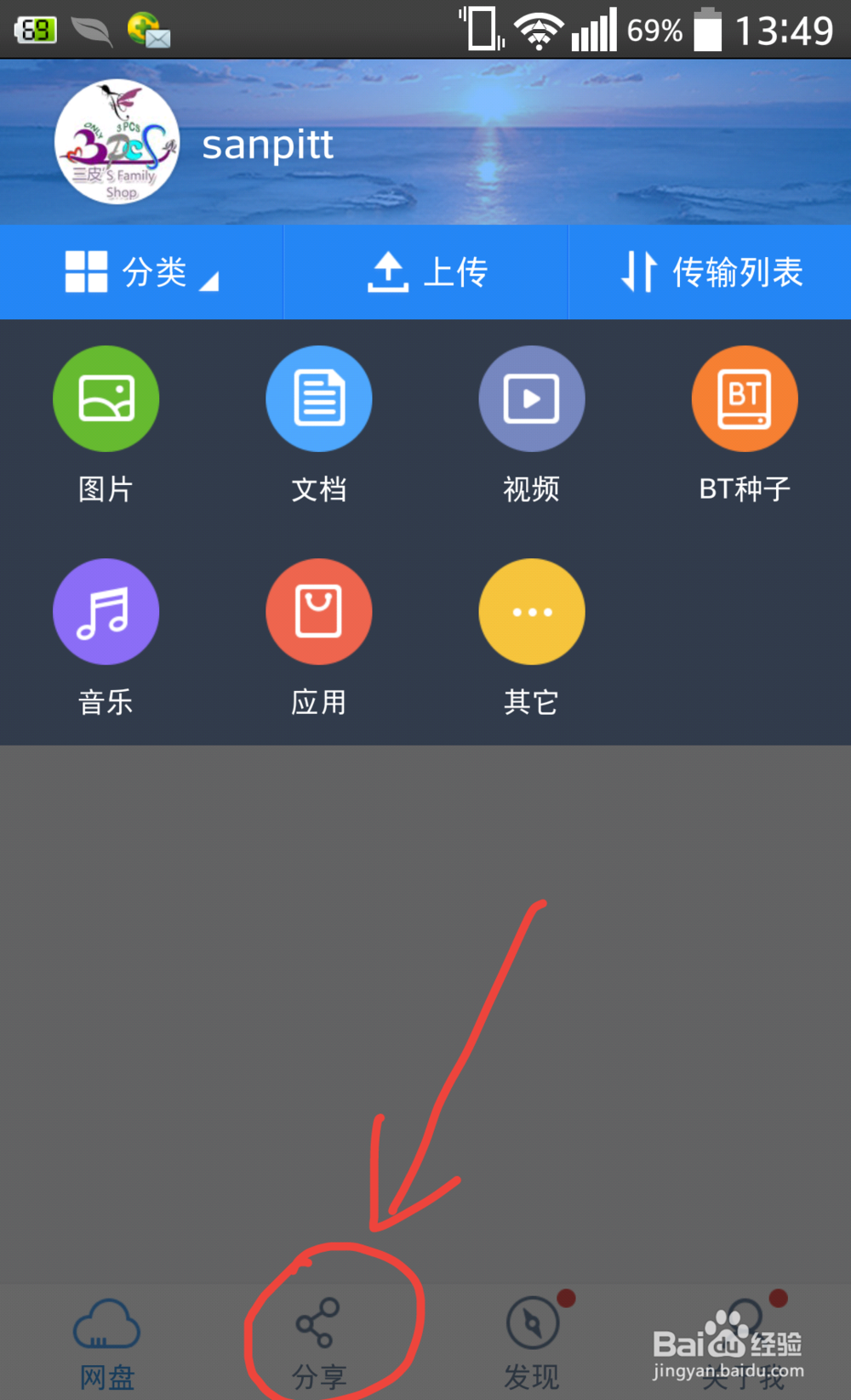 登陆进百度云之后,在主界面底部点击:“分享”。