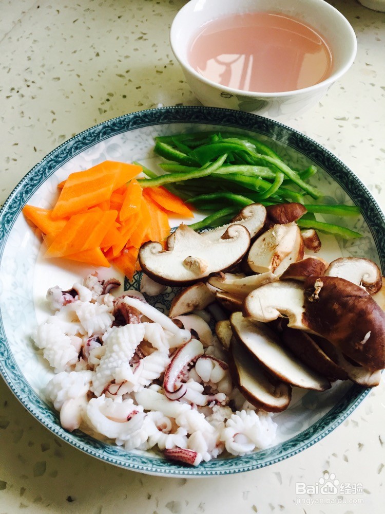 准备材料,鱿鱼切花刀焯水,焯水后剩下的汤保留。香菇切片,胡萝卜切片,青椒切丝。这里两个人的量,青椒一株,胡萝卜一株。我只用了半株胡萝卜,后来吃的时候感觉少了。