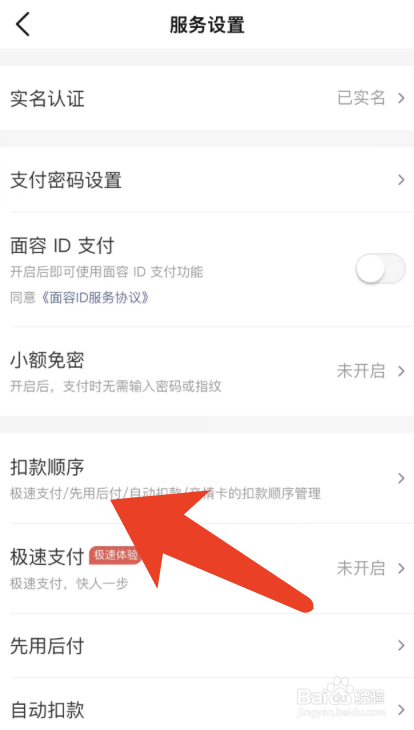 第二步,我们进入到支付设置菜单栏后,选择下方的扣款顺序选项;