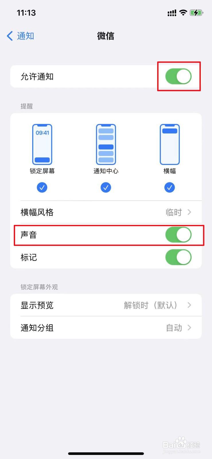 最后在微信通知里面勾选上【允许通知】和【声音】。