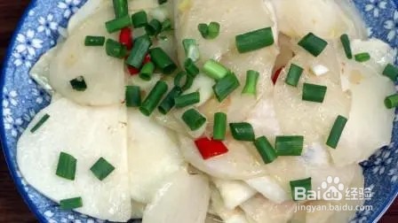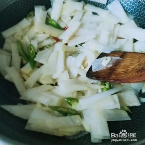 锅内倒入少许油,放入葱花炒香,放入白地瓜翻炒至断生。
