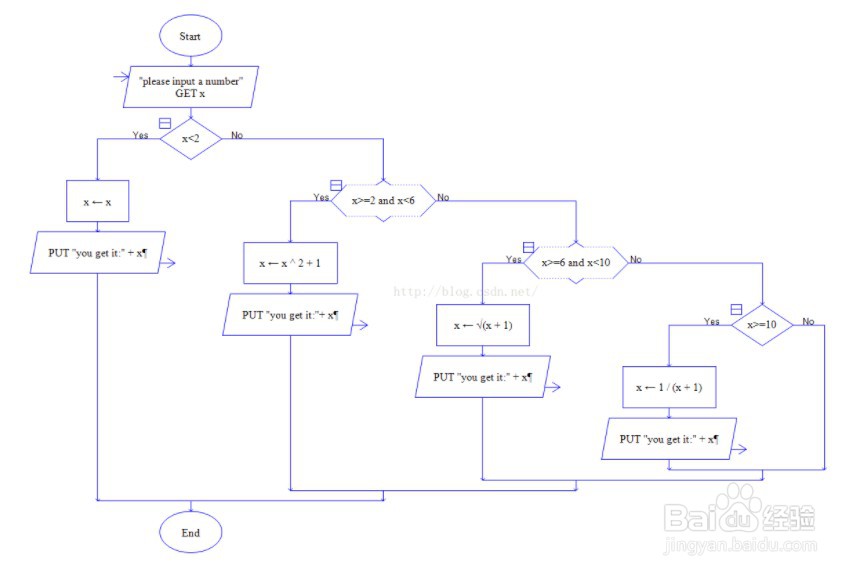 然后,根据方程式类型,依次添加输入、判断、赋值、判断、赋值、判断、输出