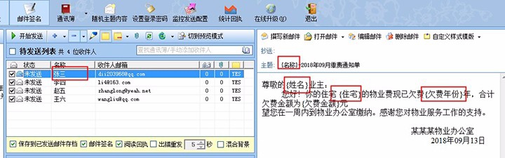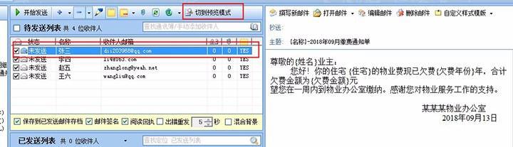接下来选中列表随便一项,点 切到预览模式,就可看到发送前每个人会收到邮件的效果。