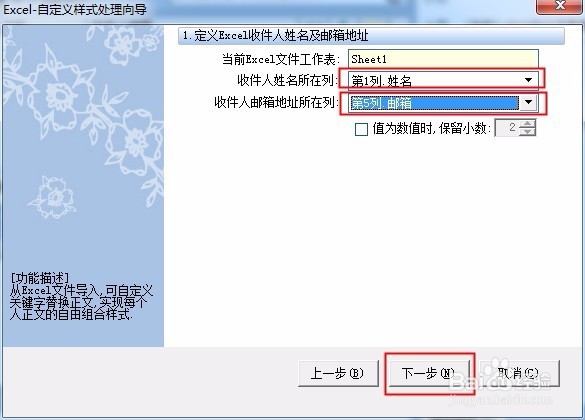 选择好后,我们点击 “下一步”,出现如下图所示的选择项,很简单,它就2项让我们选择1.收件人姓名所在列 2.收件人邮箱地址所在列