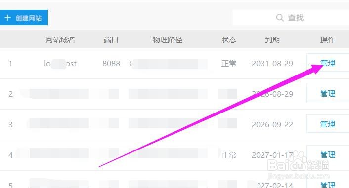 在“网站”版面中,选择一个网站后的【管理】进入。