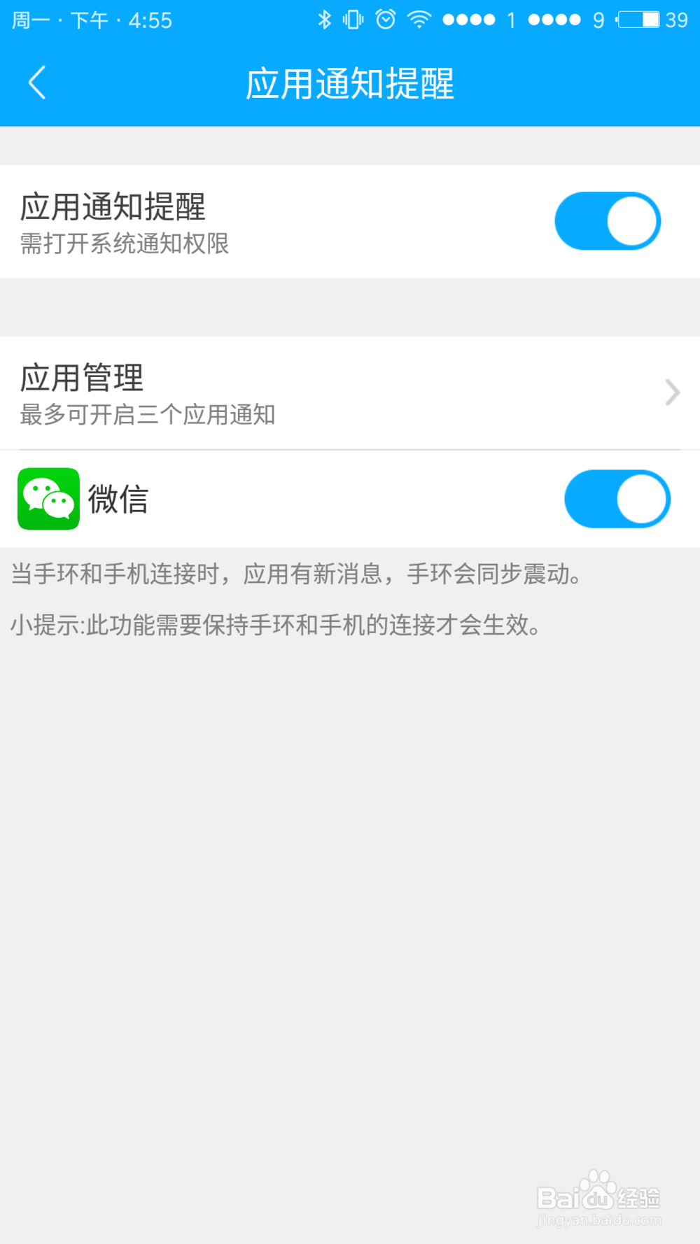 打开应用通知提醒选项,可选择打开或关闭提醒,安卓用户还可选择具体需要提醒的软件,但苹果用户因受iOS系统限制,只能选择打开微信或QQ提醒功能