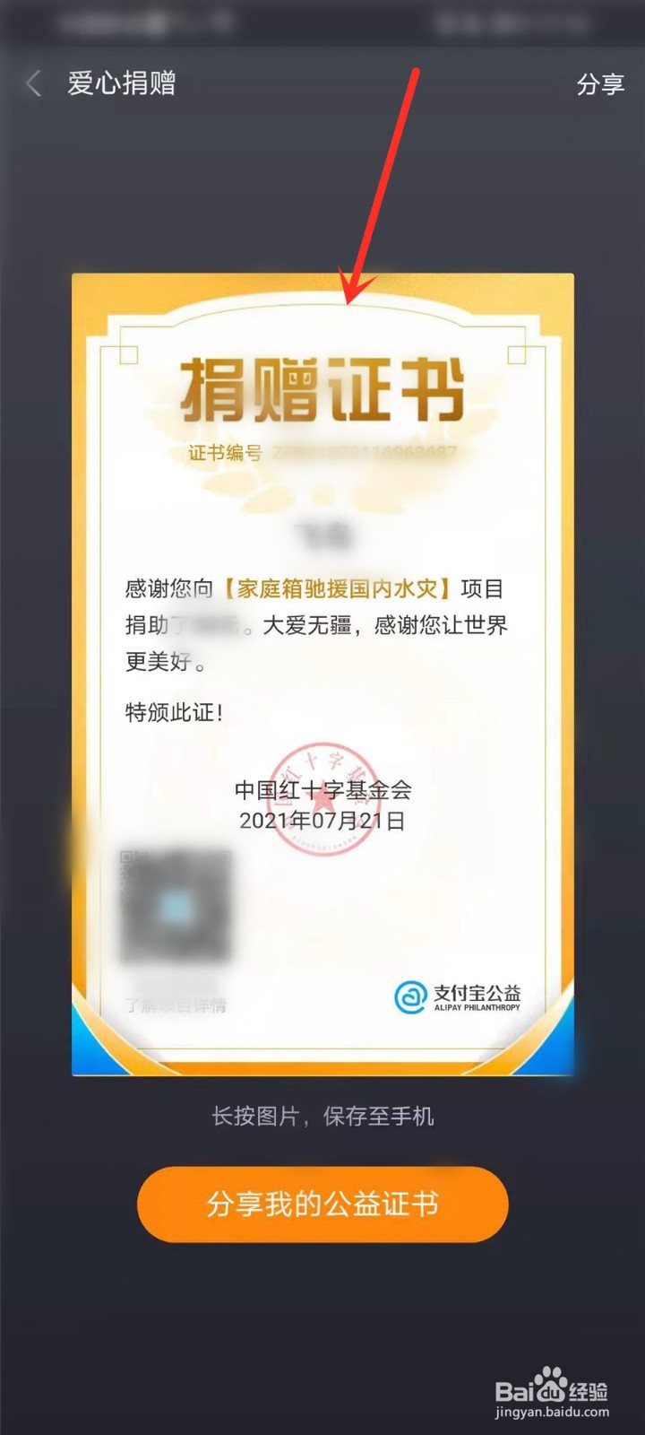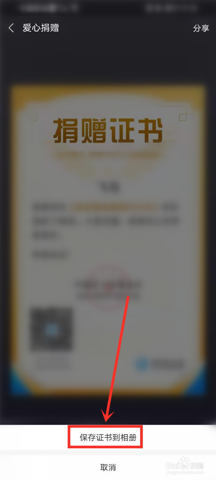 在弹出的窗口中点击【保存证书到相册】,即可将捐款证书图片保存到手机相册。