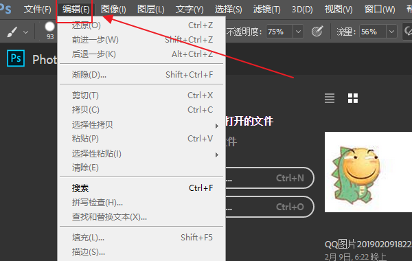 2、在PS软件上方的菜单栏左上角处点击编辑。