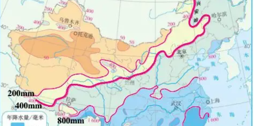 200mm等降水量线分界线是以内蒙古中部——贺兰山——祁连山经青藏高原为界,划分半干旱区和干旱区。