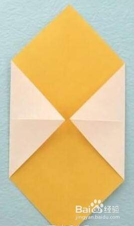 一张正方形纸,折出两条对角折后打开,把左右角向中间点折。