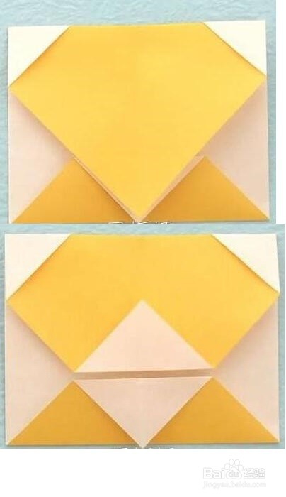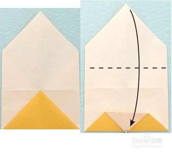 把顶角向下折到底边。再把刚折下来的角折一部分回去。