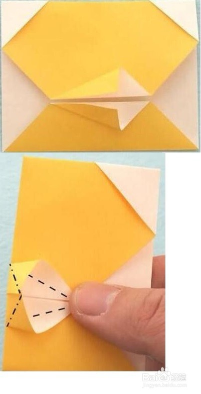 折好后如图,再把右下角沿虚线折。翻过来,另一面一样。